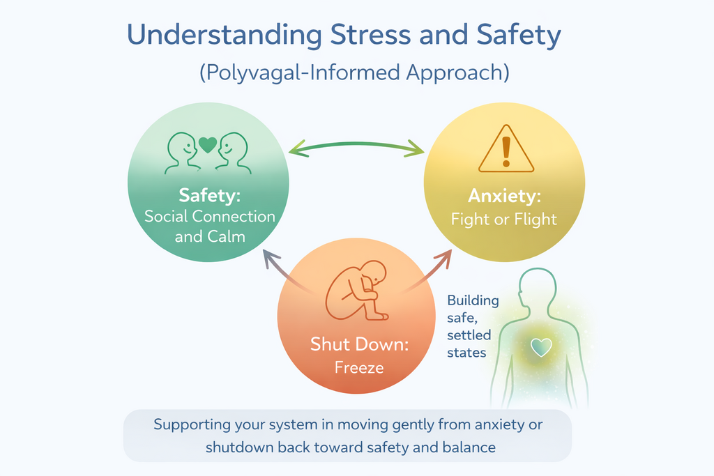 A polyvagal-informed approach simply means paying attention to how your nervous system responds to stress, and learning ways to gently bring it back into a more settled, balanced state.
