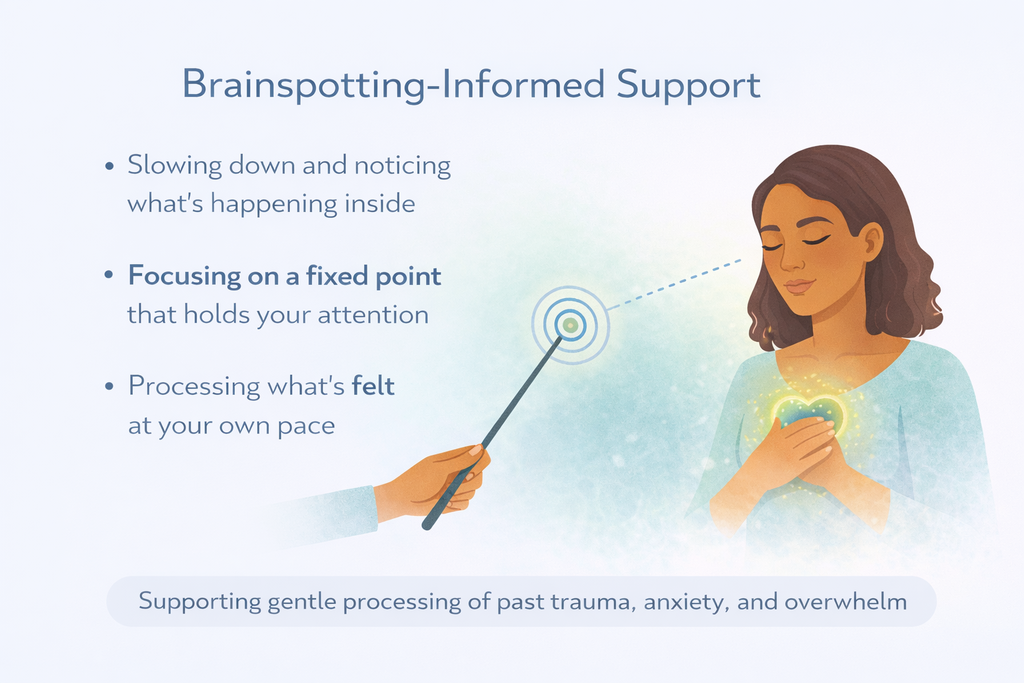 Brainspotting is a focused, body-based approach that can help access and process experiences that may feel stuck or difficult to put into words.